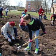 Talkotāji piedalījās veco koku celmu izrakšanā un atbilstoši sagatavotajam košumdobes projektam un dārznieces vadībā stādīja dažādu daudzgadīgo krūmu stādus - spirejas, klinšrozītes, tūjas, pacipreses, jasmīnu, arī ziedošos augus - astilbes, pīpenes u.c. Kopumā vairāk nekā 100 dažādu stādu!